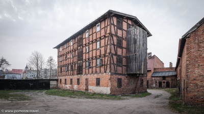 Zabytkowy spichlerz zbożowy. Budynek ten posiada cztery kondygnacje wykonane z drewna.