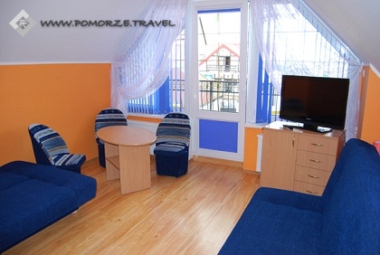 Pokoje z łazienkami. Wyposażenie każdego pokoju obejmuje: telewizor, lodówkę, czajnik oraz przybory kuchenne. Dom znajduje się w ścisłym centrum Helu w sąsiedztwie Urzędu Miasta oraz Muzeum Rybołówstwa. Z okien niektórych pokoi rozchodzi się widok na Zatokę Gdańską. **Gwarantujemy miejsce postojowe dla samochodu na ogrodzonym terenie wokoło domu**. Jest **możliwość całodziennego wyżywienia w barze**. Bar specjalizuje się we własnych wyrobach kuchni domowej.
