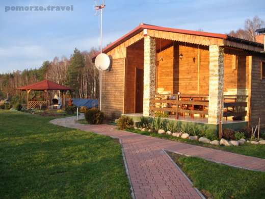 Drewniany, nowo wybudowany dom z tarasem (stół, ława, 2 fotele) komfortowo wykończony (boazeria sosnowa). Parterowy. Duży salon z częścią wypoczynkową, oddzielony od kuchni barkiem z dwoma stołkami barowymi. Kuchnia w pełni wyposażona (zastawa kuchenna, piec z piekarnikiem i rożnem, Express do kawy ciśnieniowy, kuchenka mikrofalowa, toster, lodówka). Dwa pokoje – sypialnie, łazienka z WC i prysznicem, wyposażona w pralkę, przedpokój z komfortową dużą zabudowaną szafą. Dom posiada klimatyzację. Przy domu znajduje się duże oczko wodne z fontanną, basen otwarty, altana z dużym stołem, 8 foteli, duży murowany grill, barek przenośny, lodówka na napoje, kaskada wodna, wiatrak. Druga altana kryta strzechą na 6 osób z ławami i stołem w stylu „stara wieś”, wędzarnia, suszarnia na grzyby i owoce, tenis stołowy, rowery, możliwość wypożyczenia samochodu terenowego i quadów, sprzętu sportowego. W odległości 80m od domu znajduje się duży staw (możliwość kąpieli, łowienia ryb – specjalny pomost). Do dyspozycji łódź rybacka pontonowa, wędki. Wiata na trzy samochody, parking, dla dzieci nad stawem domek na drzewie. Teren ogrodzony, monitorowany.